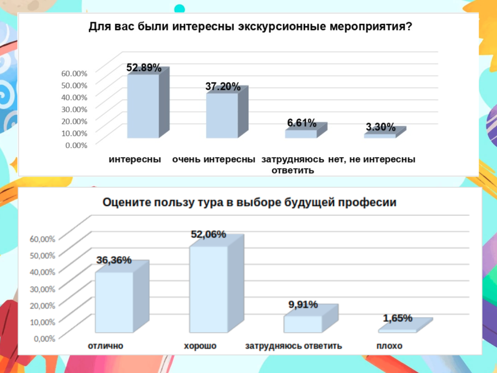 На вопрос анкеты: «Для вас были интересны экскурсионные мероприятия?» Вариант «интересны» выбрали в качестве ответа 52,89% опрошенных. 37,2% респондентов сообщили, что очень интересны, затруднились ответить 6,61%, а ответ «нет, не интересны» выбрали 3,3%. Больше половины опрошенных ребят (52,06%) оценили пользу тура на «хорошо». 36,36% оценили пользу тура на «отлично». Затруднились ответить 9,91%. Не оценили пользу тура 1,65% респондентов.