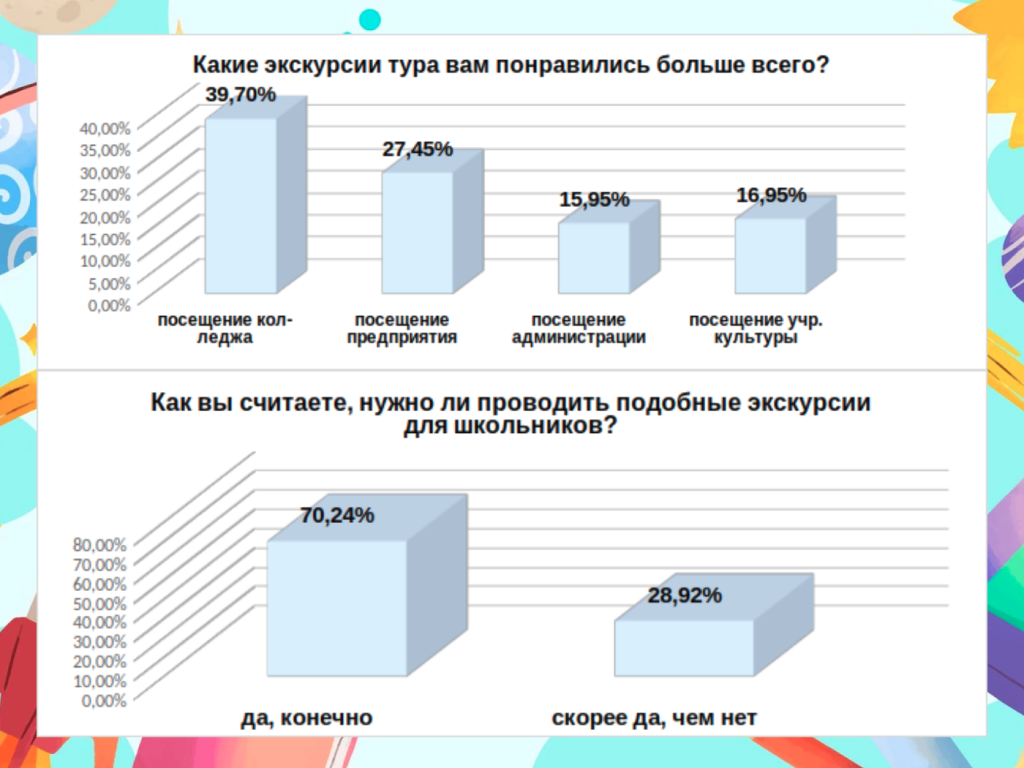 Для этих же детей следующим вопросом был «Были ли во время тура представлены профессии по которым вы планируете дальнейшее обучение или уже поступили в соответствующий колледж/техникум?». Ответ «это похожая профессия» выбрали 41,9% респондентов, «да, это одна из них» выбрали 25,8%. Сказали, что это совершенно другая сфера 17,7%, затруднились с ответом 14,5% опрошенных. Необходимо отметить, что из указанного процента 41,9% детей, имеются сведения о конкретных учащихся, которые поступили в профессиональные организации и получают те специальности (профессии), с которыми они познакомились во время тура (это такие специальности как учитель, электромонтер).Единственный вопрос в анкете, который предполагал возможность выбора нескольких вариантов ответов - это вопрос «Какие экскурсии тура вам понравились больше всего?». Предлагалось выбрать несколько мест, которые традиционно присутствуют в программе тура: колледж (техникум), предприятие (организация), администрация муниципального округа, учреждение культуры. В представленном списке лидирующую позицию по предпочтениям школьников занимает колледж (техникум) - 39,7%, на втором месте (27,45% респондентов отметили) - предприятие/организация, на третьем месте (16,95% респондентов отметили) - учреждение культуры, и 15,95% выбирали администрацию муниципального округа.