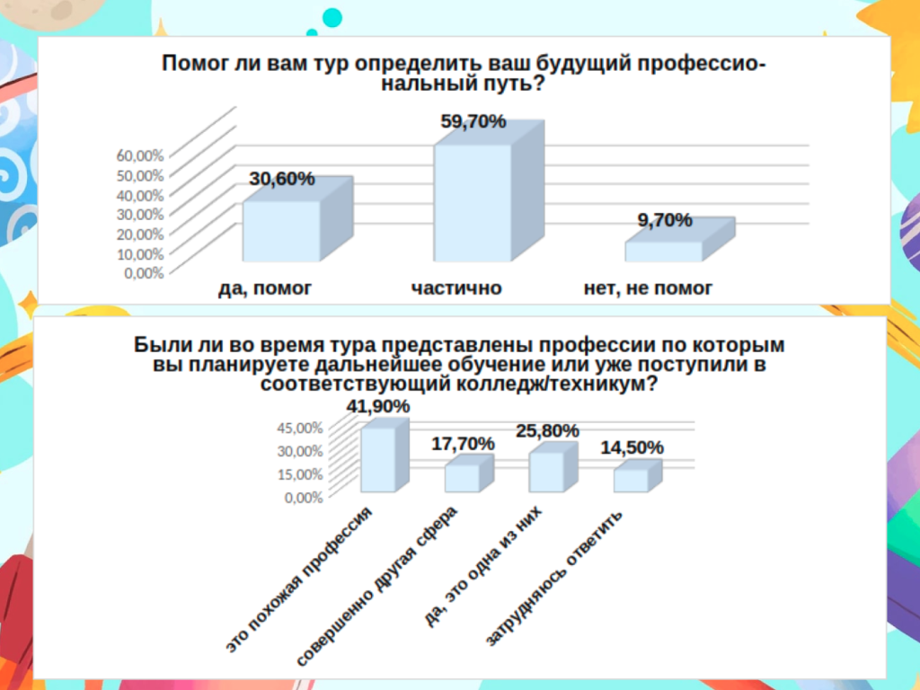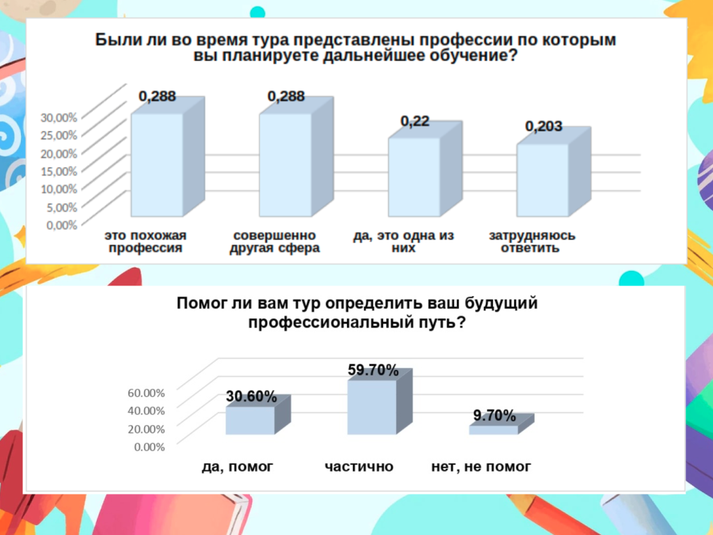На вопрос анкеты для этих же респондентов: «Были ли во время тура представлены профессии по которым вы планируете дальнейшее обучение?» 22% ответили, что планируют поступление по представленной во время тура профессии. 28,8% сообщили, что это похожая профессия, 28,8% сказали, что выбирают совершенно другую сферу, а 20,3% затруднились ответить. Для ребят, участвовавших в турах в прошедших учебных годах, на вопрос: «Помог ли вам тур определить ваш будущий профессиональный путь?». Ответы были следующими: утвердительно на этот вопрос ответили 30,6% школьников, ответ «частично» выбрали 59,7% респондентов, «нет, не помог» – ответили 9,7%.